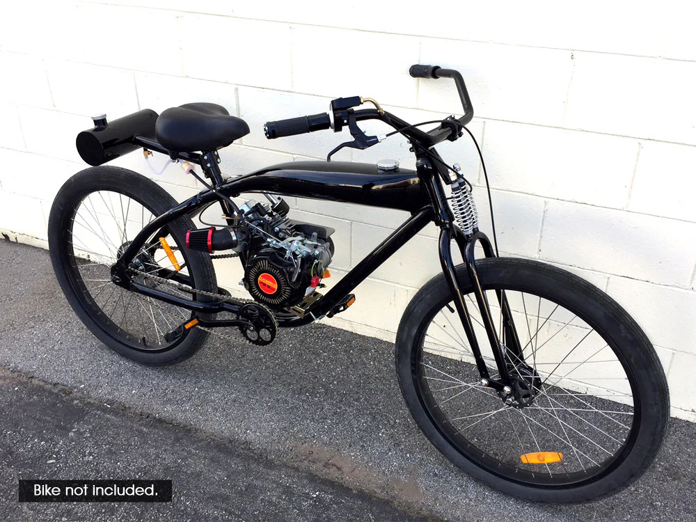 4 Stroke engine kits are very different from 2 stroke kits in many ways. Building a 4 stroke bike is a little more involved then the two strokes, the extra effort is worth it. Pull start engine, not push start like the 2 strokes. Overall this type of engine is more reliable with more power and torque. With some of the larger cc motors, the top speeds far exceed the 2 strokes. Since these motors are larger in cc they are also larger in size and weight. Almost all bicycles will need to use a wider crank setup to clear the motor, the stock arms and pedals will hit the motor when pedaled as a regular bike. One piece cranks will also require a bottom bracket conversion set as well (not included).